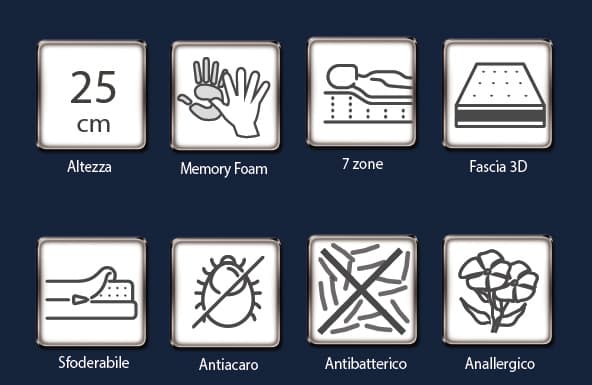 • Struttura ergonomica a 2 strati di poliuretano a portanza differenziata ed uno strato di Memory Foam ad alta densita’.